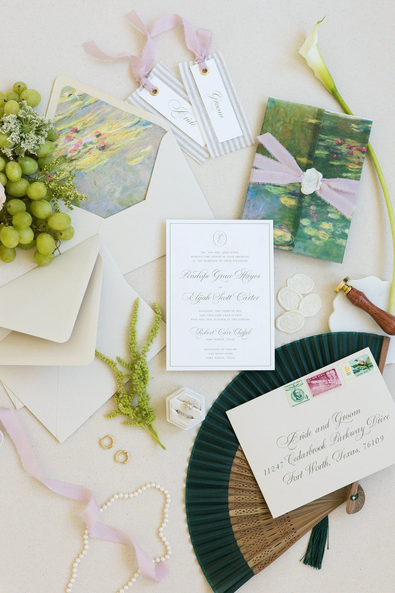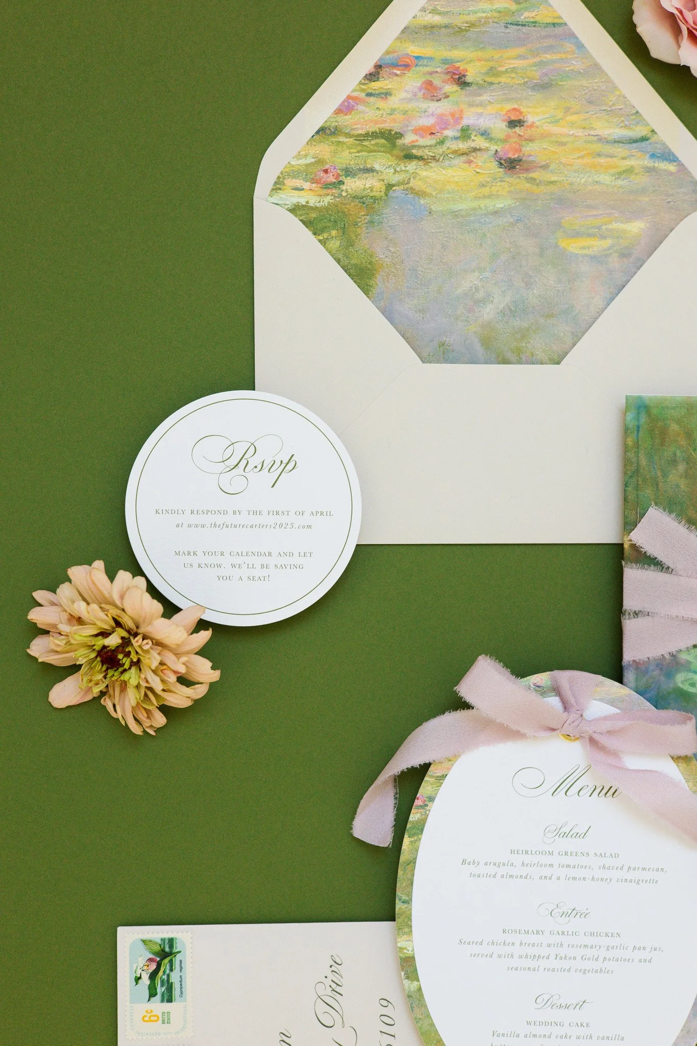 Digital Printing | Felt Textured Paper | Vintage Art Envelope Liner | Die Cut Cards | Vellum Wrap | Wax Seal | Silk Ribbon | Digital Guest Addressing | Vintage Postage | Custom Bar Signage | Custom Layered Menu